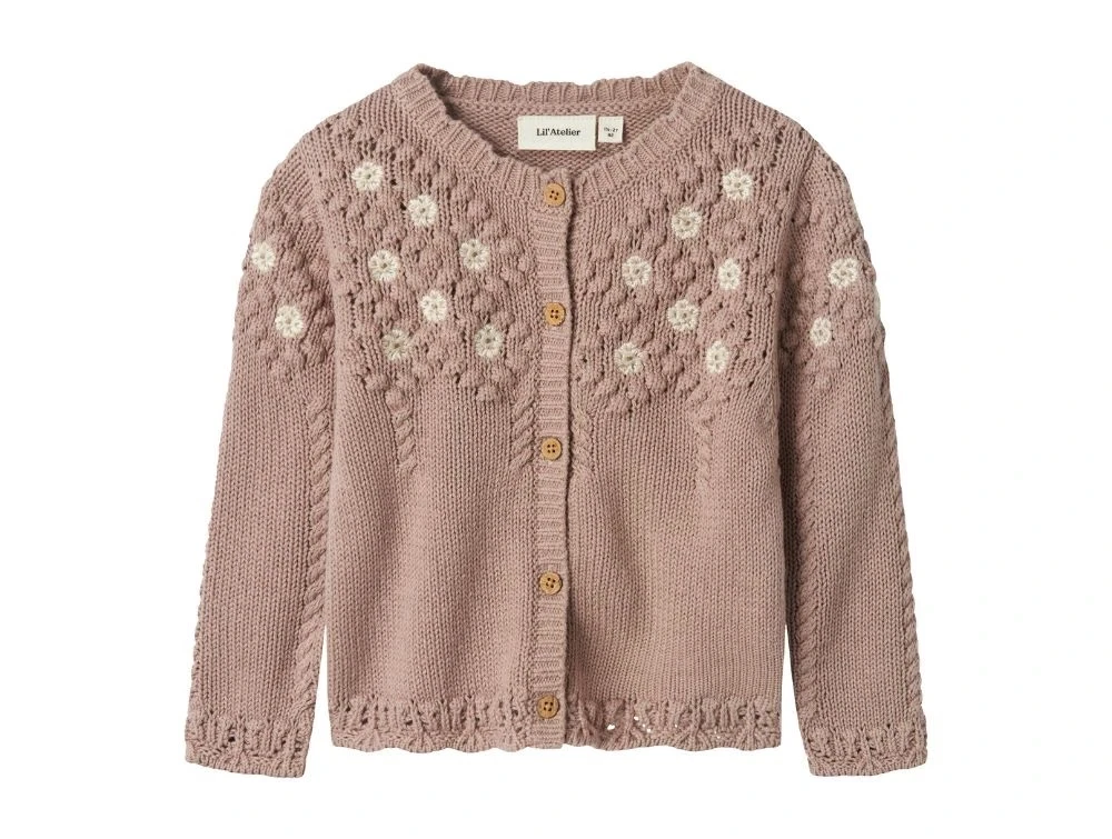 Strikcardigan i farven etherea med blomster fra Lil' Atelier.