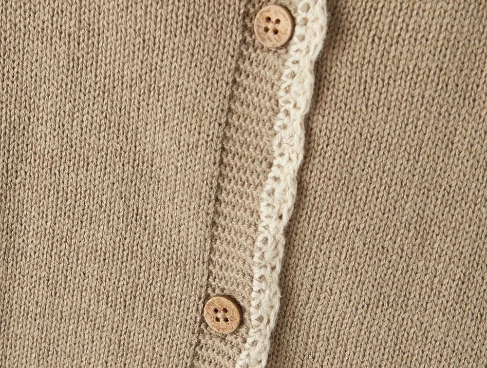 Cardiganen har en O-hals og lange ærmer og lukkes med knapper.