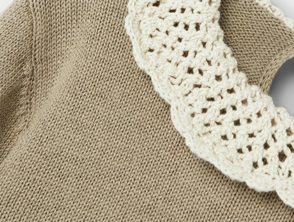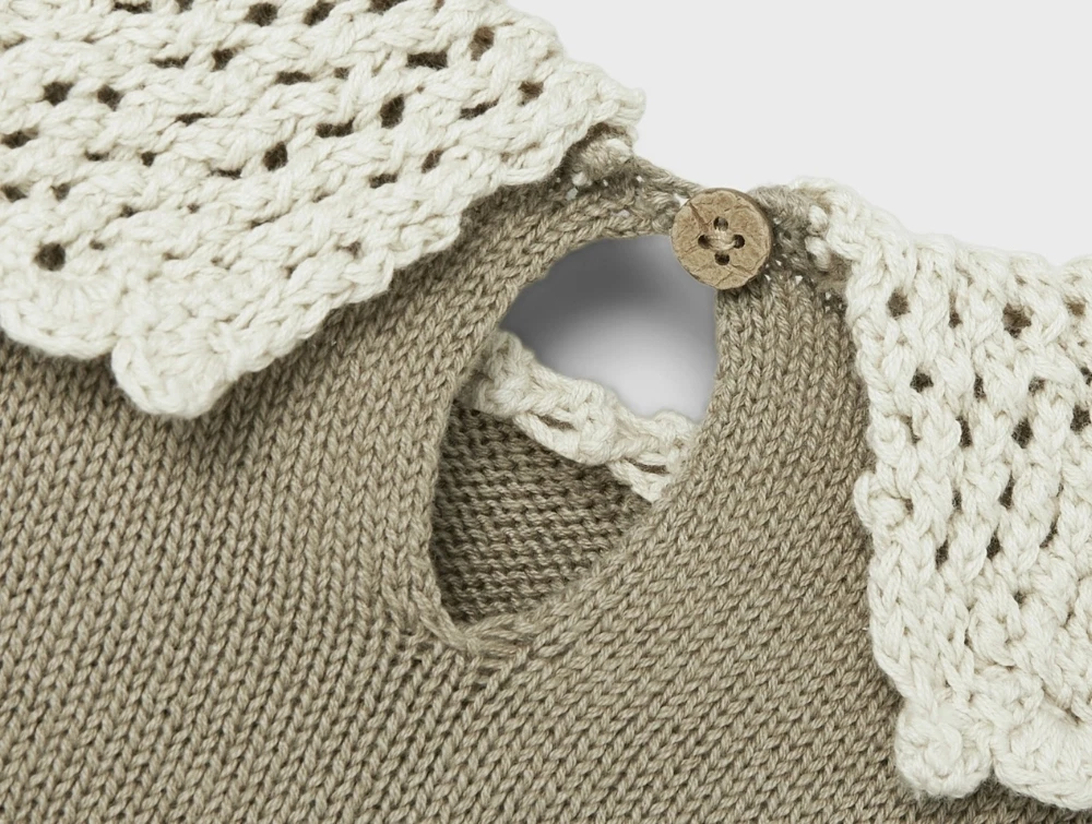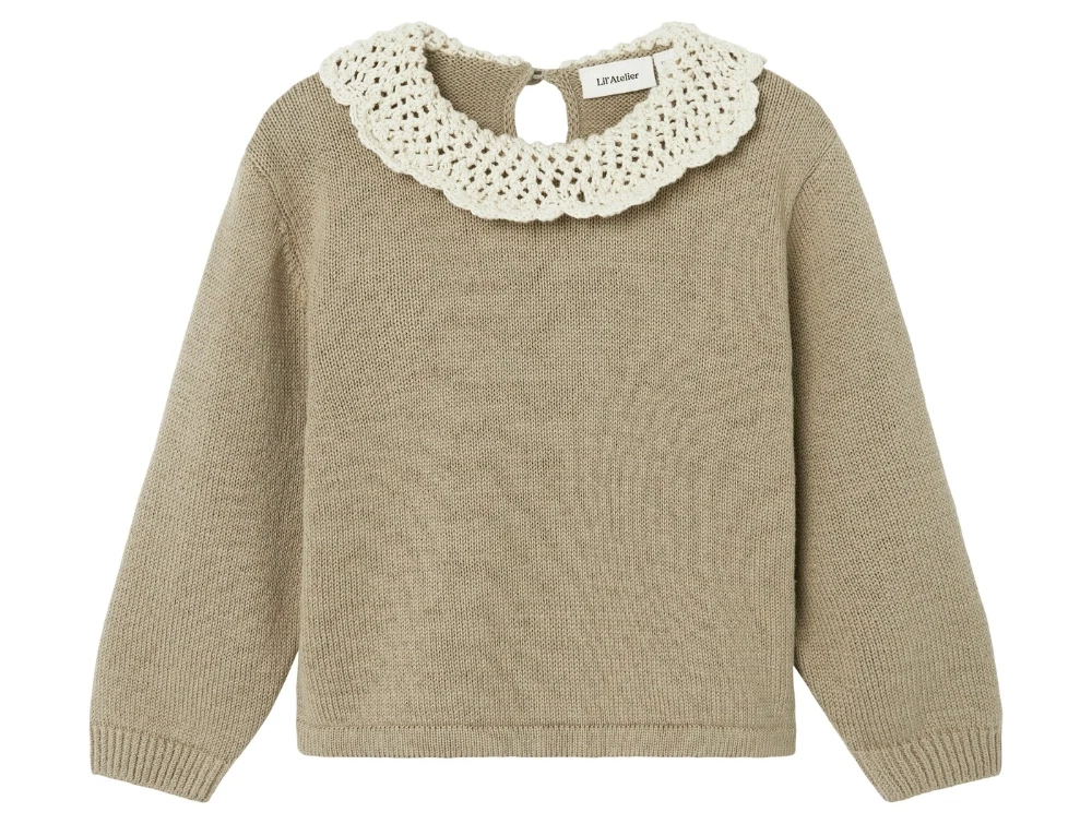 Strikbluse i farven chinchilla med hulmønster-krave fra Lil' Atelier.