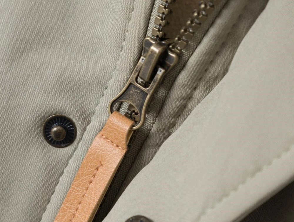 Jakken har to lommer med lynlås og jakken lukkes med lynlås og knapper.