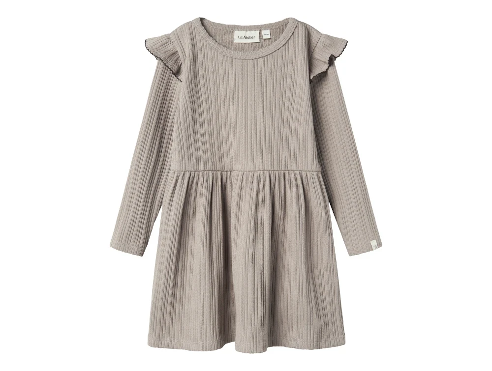 Kjole i farven etherea med flæser fra Lil' Atelier.