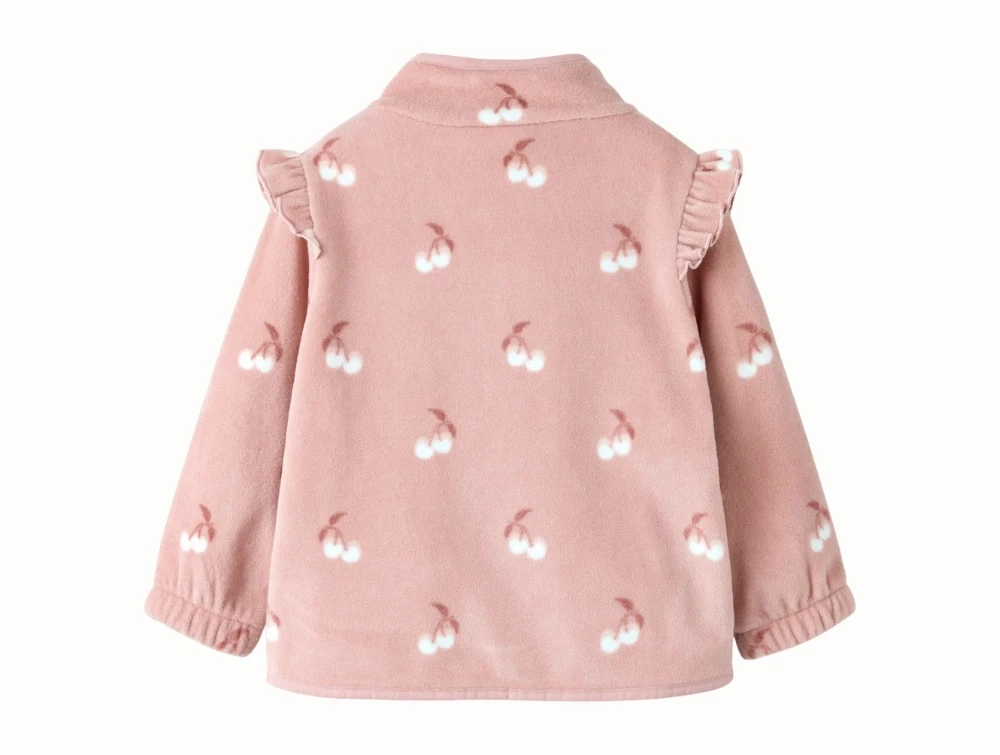 Fleecejakke i rosa nuance (misty rose cherry) fra Lil' Atelier med kirsebærprint og fine flæsedetaljer ved skuldrene.