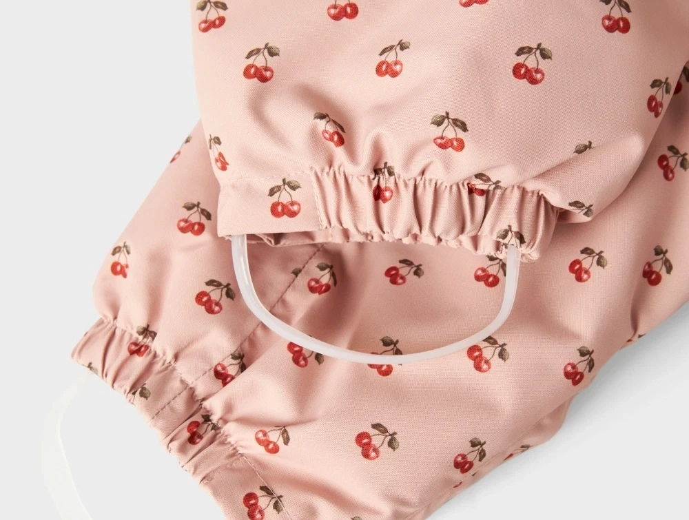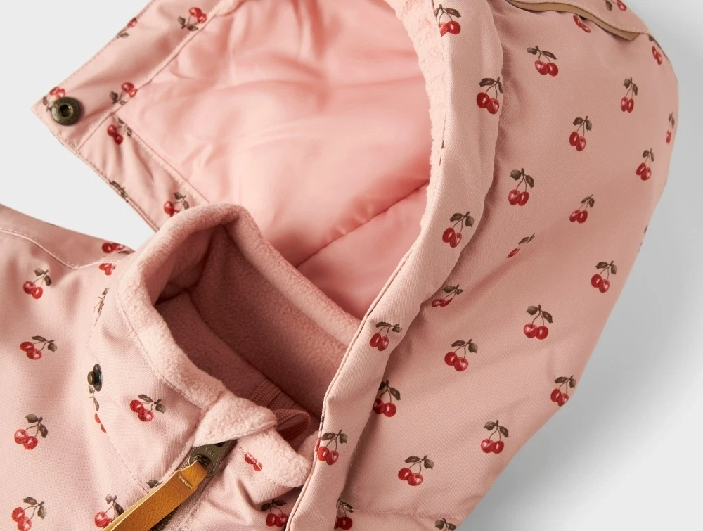 Yderstoffet er testet til 50.000 Martindale og har en membran, der beskytter mod både vind og vand. Fleeceforet giver varme, mens det dekorative kirsebærprint tilføjer et charmerende udtryk. Dragten er smudsafvisende og funktionel i hverdagen.
