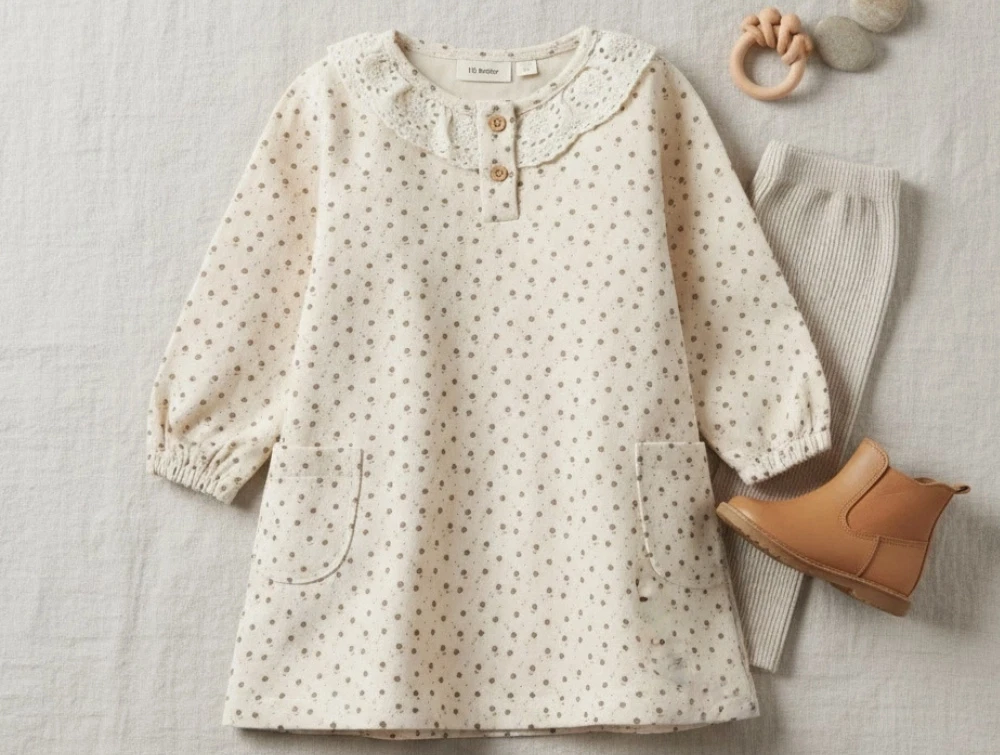 Kjolen har flæse omkring halsen og to knapper.