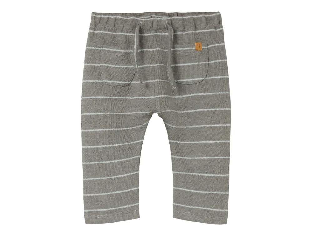Afslappede bukser i grå med smalle hvide striber, designet til de mindste. Modellen har en lille lomme foran, indvendig justerbar knaphulselastik i taljen og bindebånd på ydersiden. Den bløde bomuldskvalitet gør bukserne behagelige at have på.