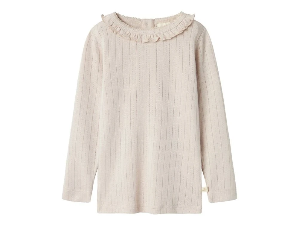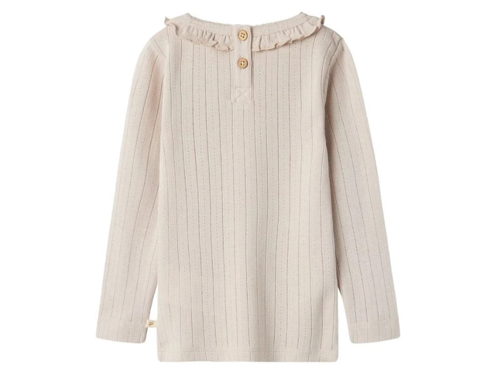 Langærmet top med hulmønster og flæsekrave i farven gray morn fra Lil' Atelier. Toppen lukkes med to knapper i nakken.