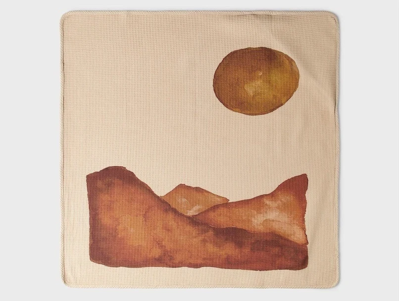 Håndklædet har landskabsprint på ydersiden.