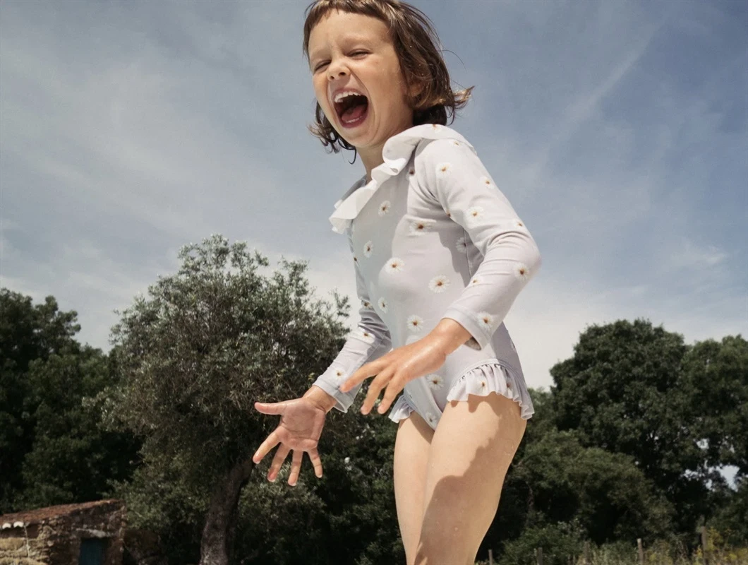 Badedragt i farven harbor mist med blomsterprint fra Lil' Atelier.