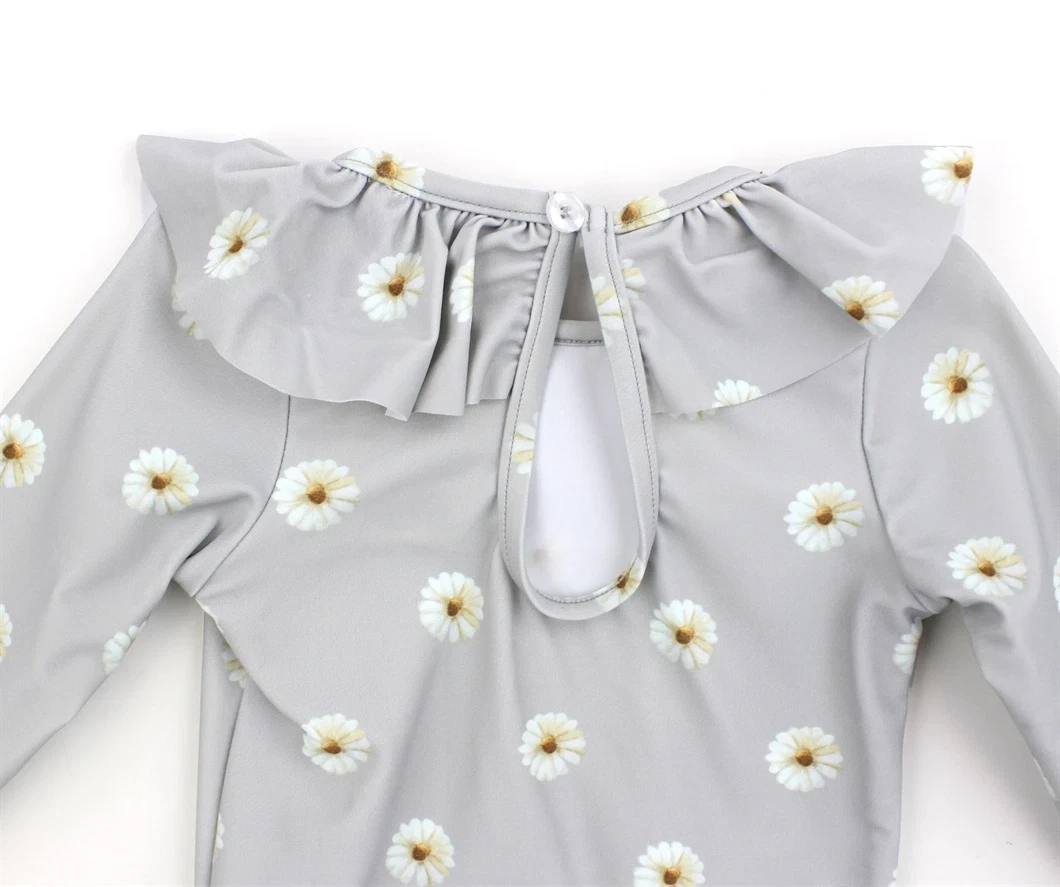 Badedragten har lange ærmer og flæse krave. Dragten lukkes med knap i nakken.