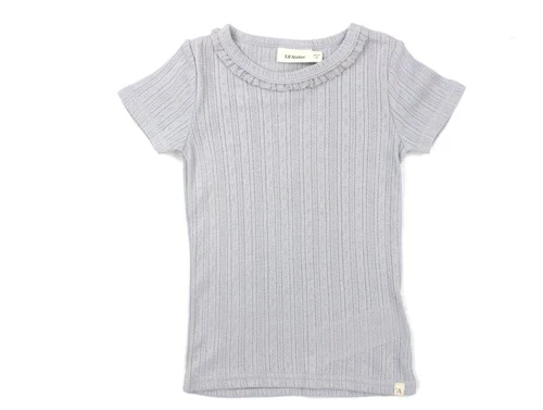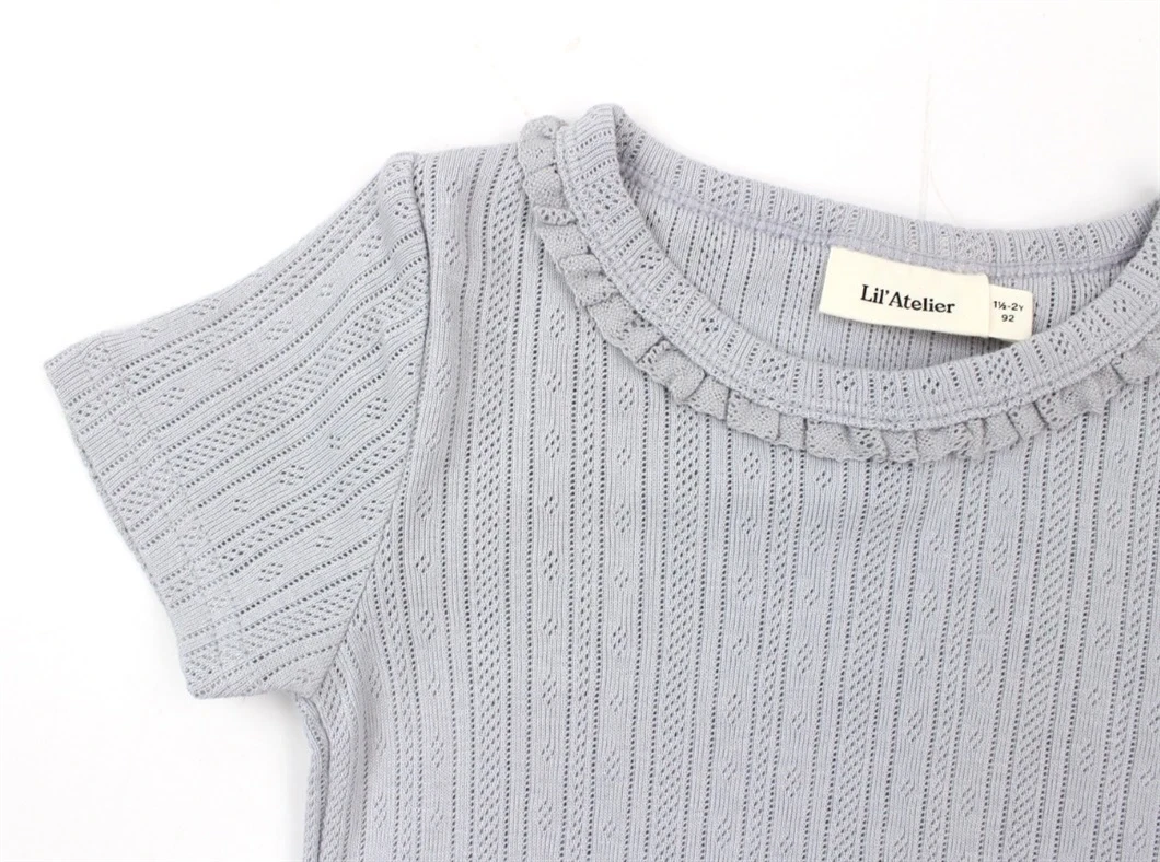 Top med hulmønster og lille blondeflæse i krave i farven harbor mist fra Lil' Atelier.