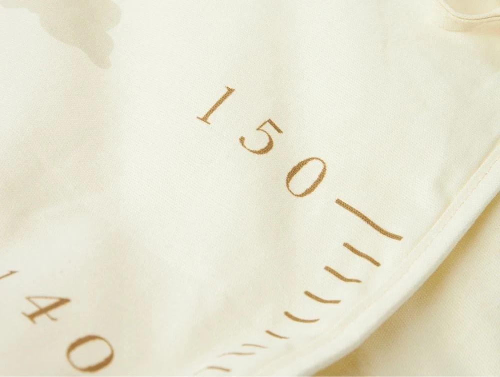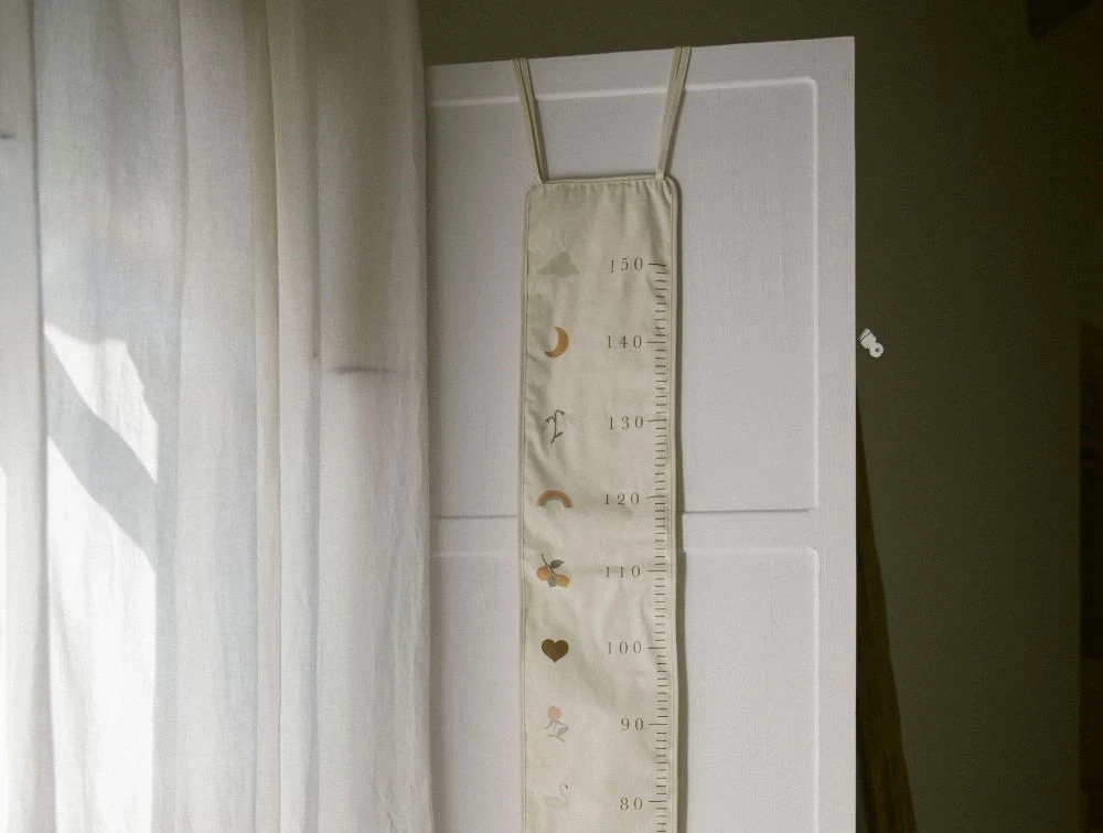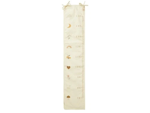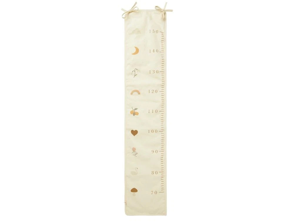 Smuk og funktionel højdemåler fra Lil' Atelier i en vævet kanvaskvalitet med et enkelt krydsmønster og en let tekstur i overfladen. Den råhvide baggrund er dekoreret med fine illustrationer ved hver højdeangivelse, hvilket gør målingen af barnets vækst til en hyggelig oplevelse.