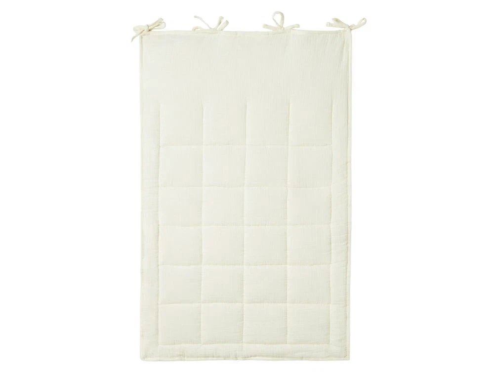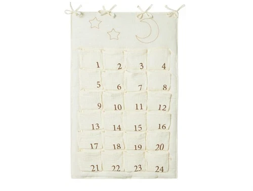 Vægophængt julekalender i quiltet muslinkvalitet med 24 lommer til små gaver og overraskelser. Hver lomme har mørkebrune printede tal fra 1 til 24. Øverst på kalenderen er der broderet to gyldne stjerner og en måne, som tilføjer et fint og stemningsfuldt udtryk. Kalenderen hænges op med bindebånd i toppen.