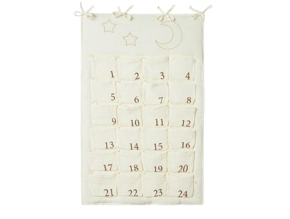 Råhvid pakkekalender til jul med 24 lommer fra Lil Atelier 13211000 turtledoveRåhvid pakkekalender til jul fra Lil Atelier 13211000 turtledove bagfraRåhvid pakkekalender til jul med gyldent stjerne og månebroderi fra Lil Atelier 13211000 turtledove