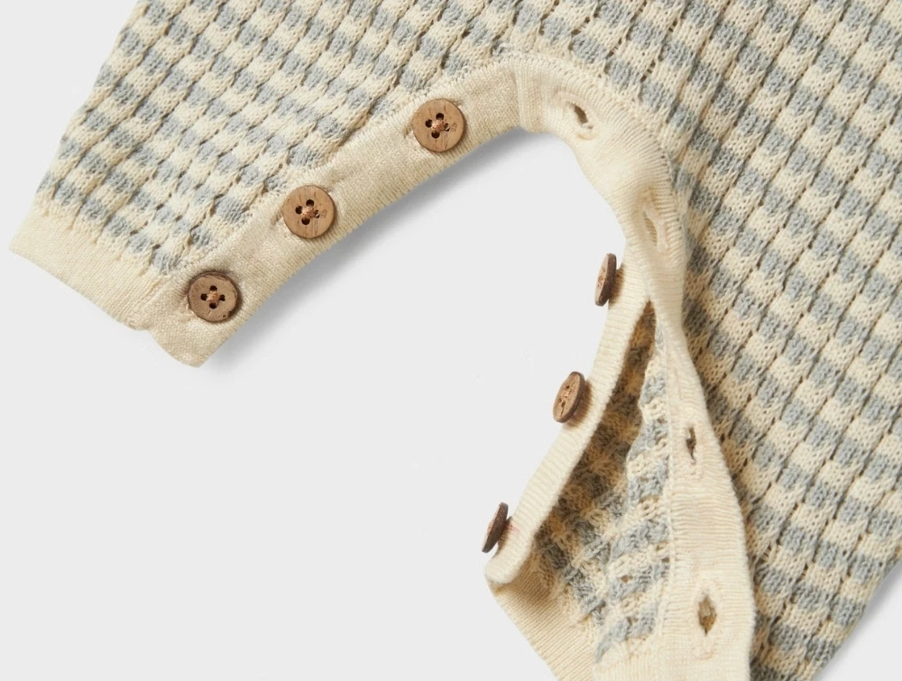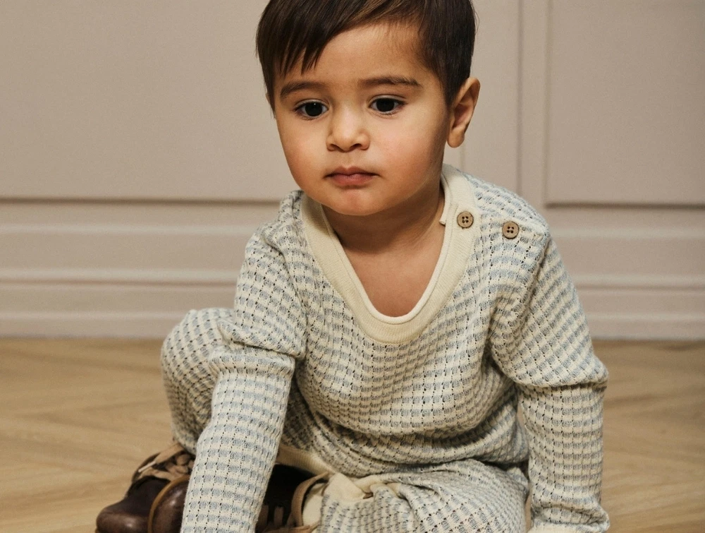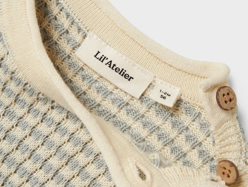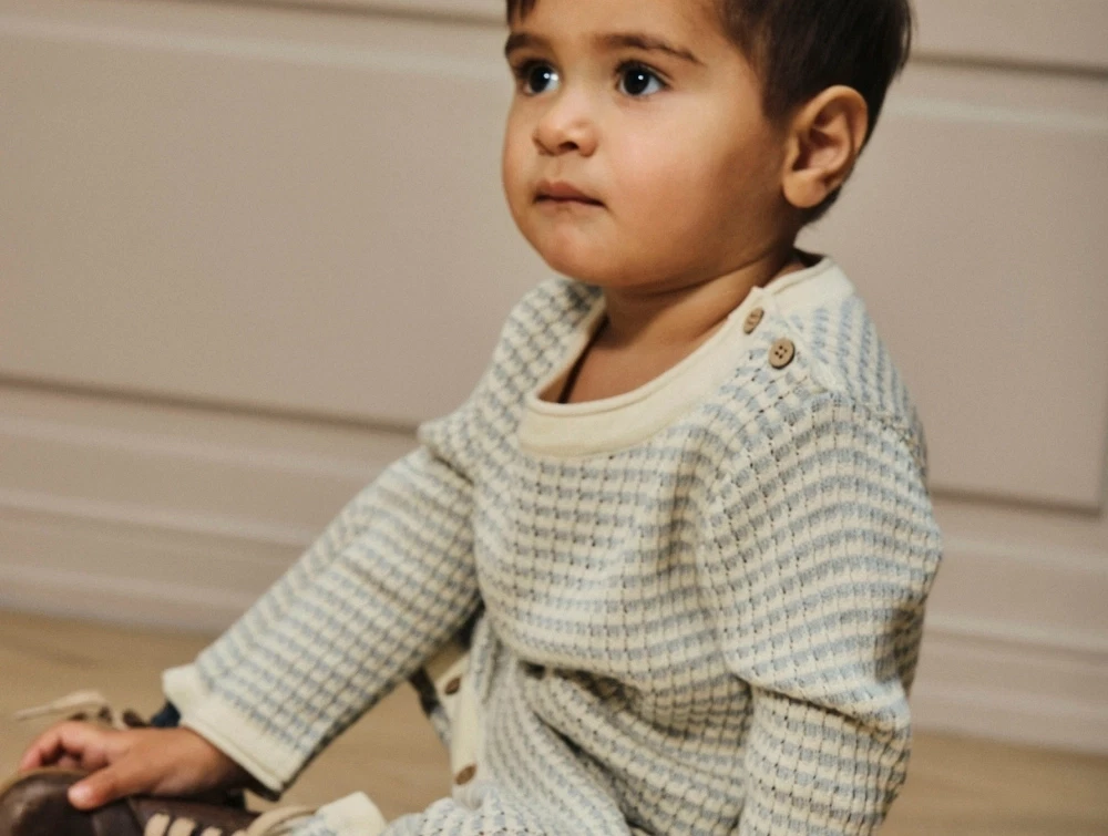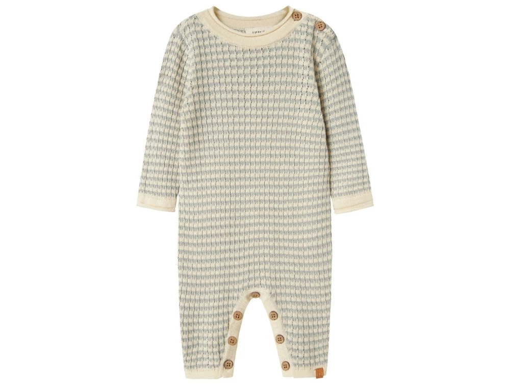 Jumpsuit i dueblå og råhvid nuance fra Lil' Atelier med knapper langs benene. En blød og behagelig style til de mindste med smukt vævet struktur.