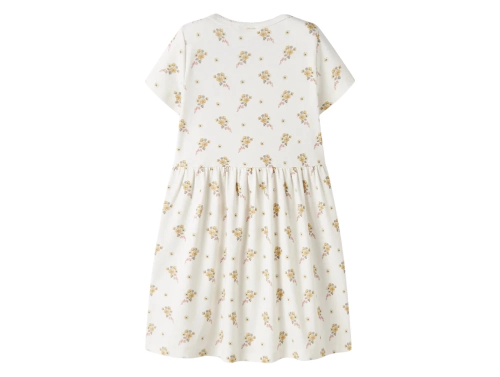 Kjole i råhvid nuance (coconut milk) fra Lil' Atelier med små blomsterprint og flæsedetaljer ved stolpelukningen.