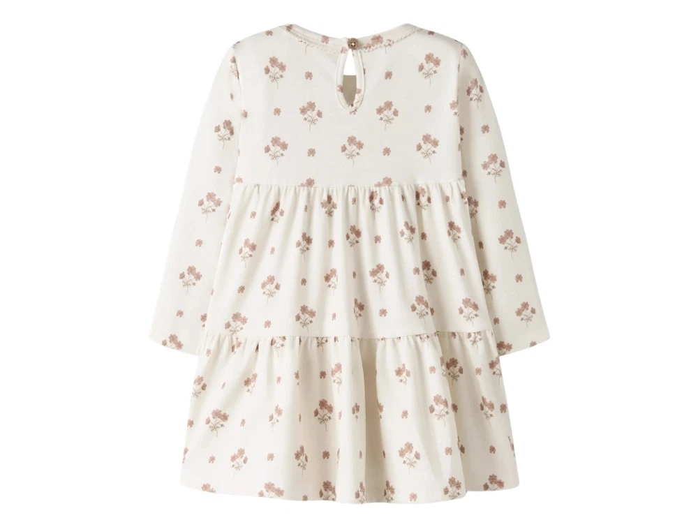 Kjole i råhvid nuance (coconut milk) fra Lil' Atelier med små blomsterprint i bløde rosa toner.
