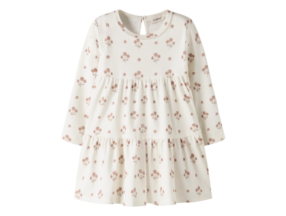 Lil\' Atelier kjole i råhvid nuance med rosa blomsterprintLil\' Atelier kjole coconut milk med rund hals og knaplukningLil\' Atelier kjole med lange ærmer og blomsterprint