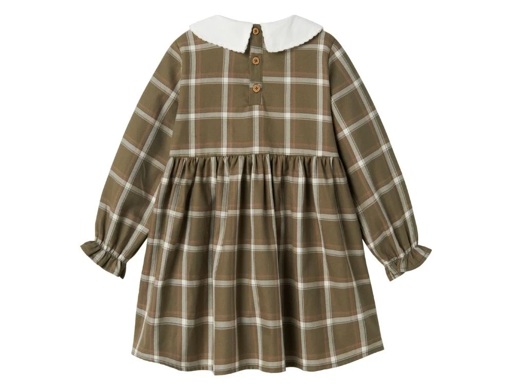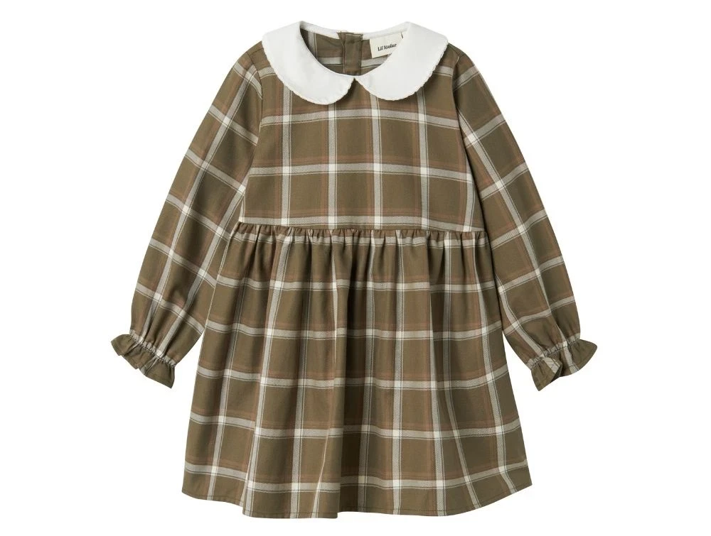 Smuk kjole fra Lil' Atelier i en dyb kalamata-grøn nuance. Kjolen er lavet i vævet 100% økologisk bomuld, der har en let tekstur og et klassisk udtryk.