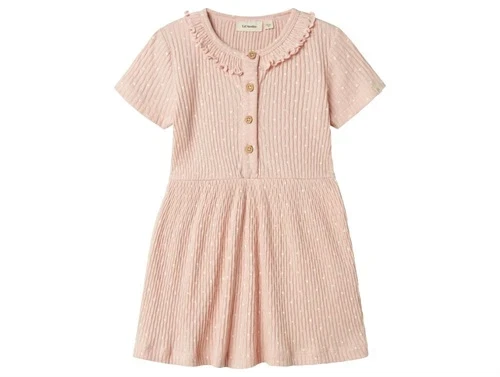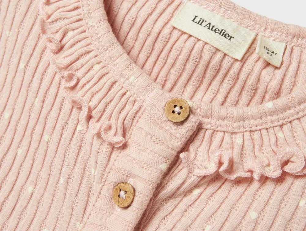 lil\' atelier kjole i peach whip med korte ærmer, knapper og flæsedetalje, set forfranærbillede af flæsekrave og knapper i lyserød lil\' atelier kjole med struktur