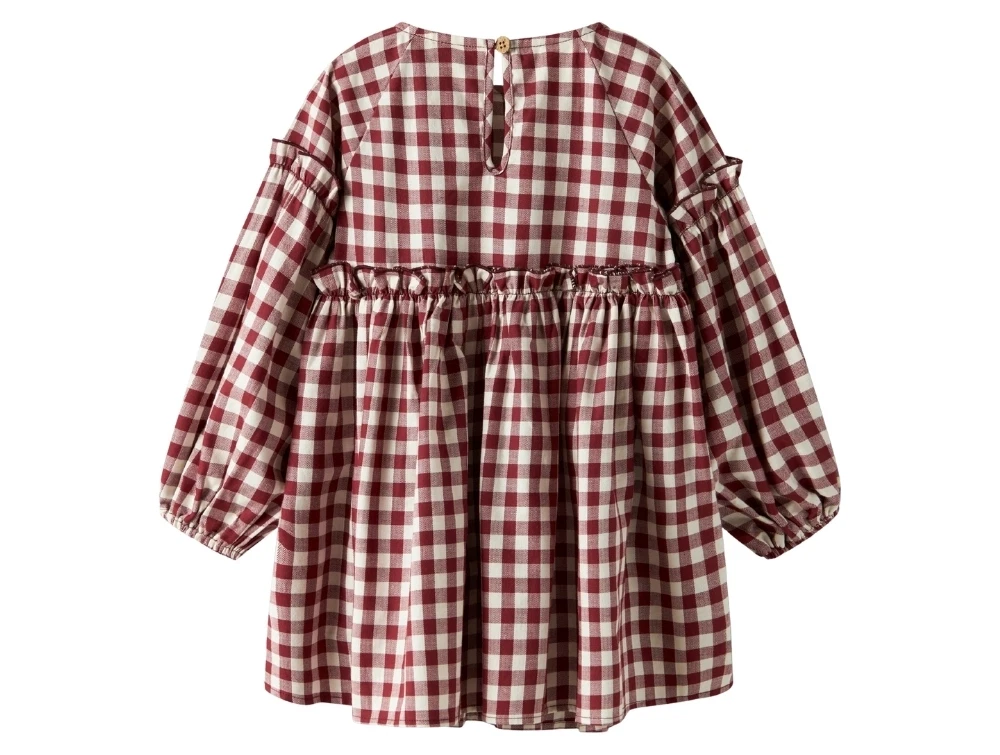 Lil\' Atelier kjole i red dahlia ternet med flæserBarn iført Lil\' Atelier ternet kjole i red dahlia med flæserDetalje af Lil\' Atelier kjole i red dahlia ternet stofBagside af Lil\' Atelier ternet kjole i red dahlia med flæser