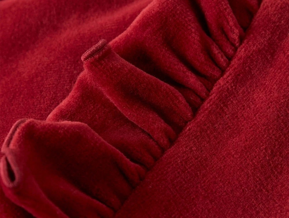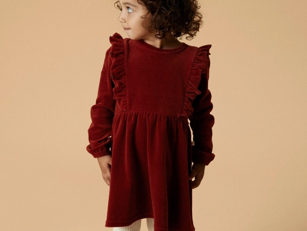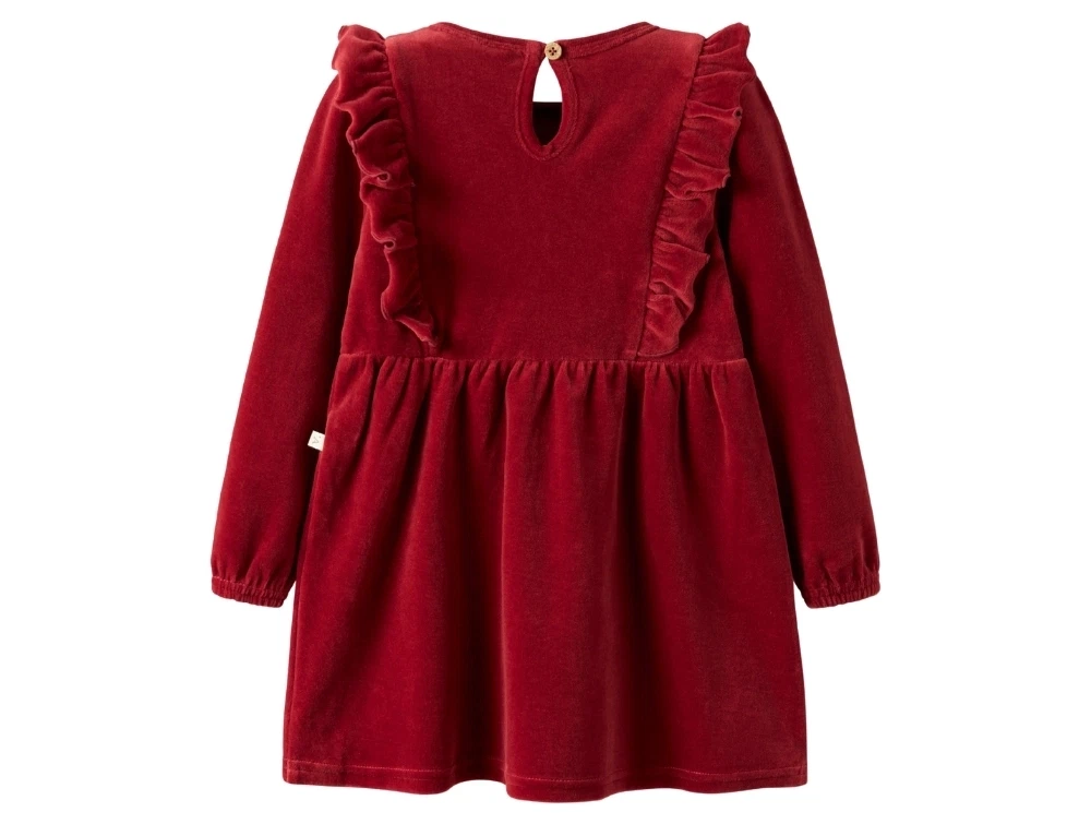 Barn iført Lil\' Atelier kjole i red dahlia velour med flæserLil\' Atelier kjole i red dahlia velour med flæserDetalje af blød velour på Lil\' Atelier kjole i red dahliaBagside af Lil\' Atelier kjole i red dahlia velour med flæser
