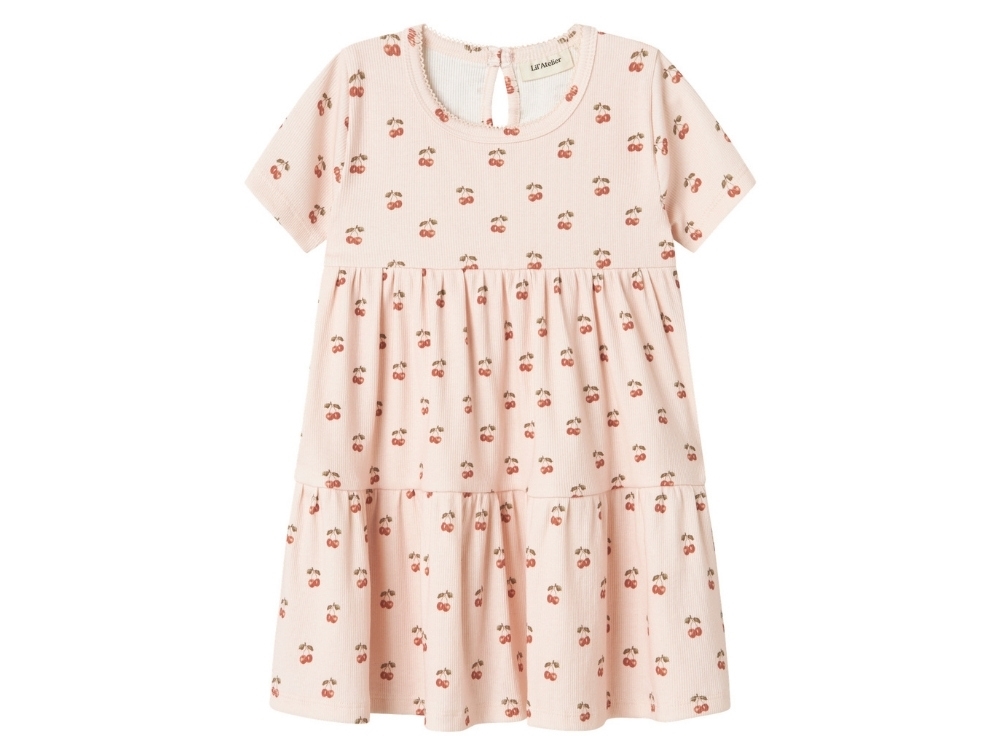Kjole i lys rosa nuance fra Lil' Atelier med sødt kirsebærprint. Den har korte ærmer, rund hals og knaplukning bagpå. En blød og let style med god bevægelsesfrihed.