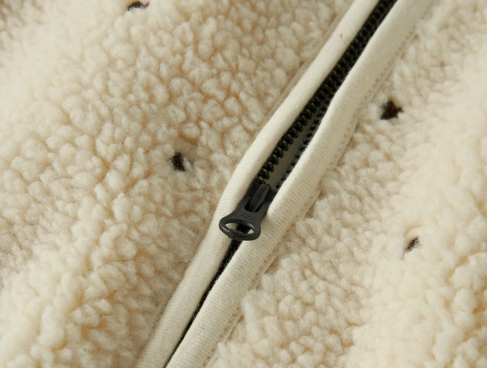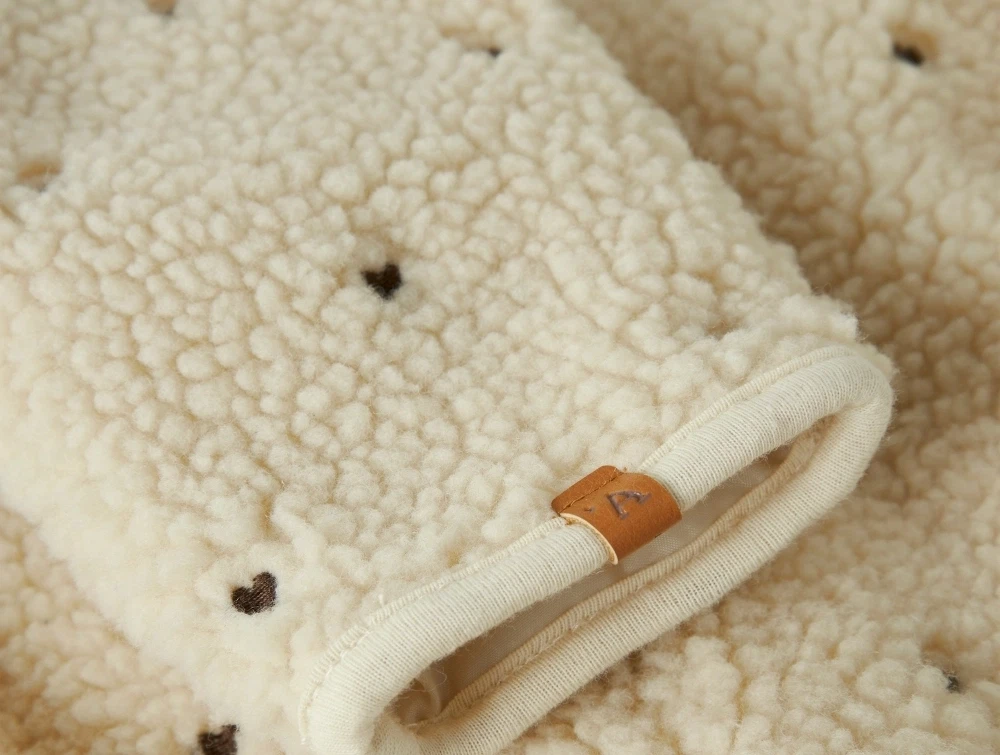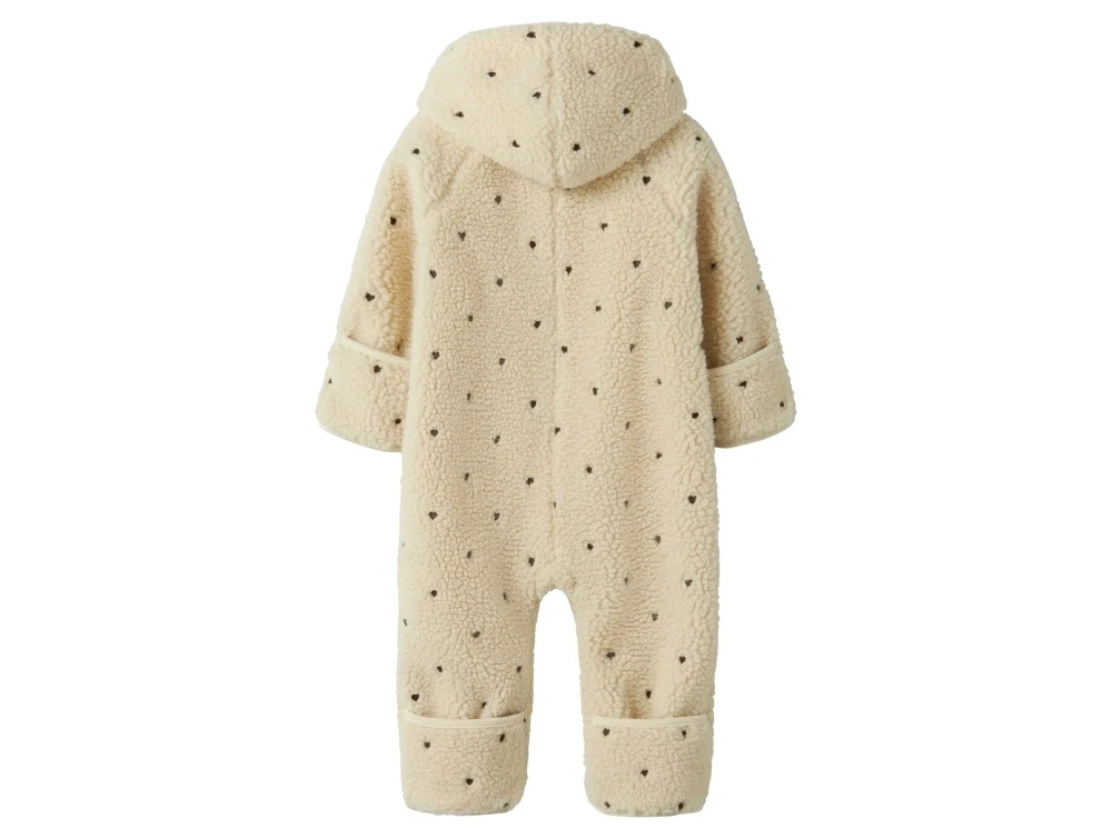 Dragten er fremstillet i blød teddyfleece af 100% genanvendt polyester og er perfekt til de mindste på kolde dage. Den har foldbare kanter ved hænder og fødder, så barnet kan holdes ekstra varmt, når temperaturen falder.