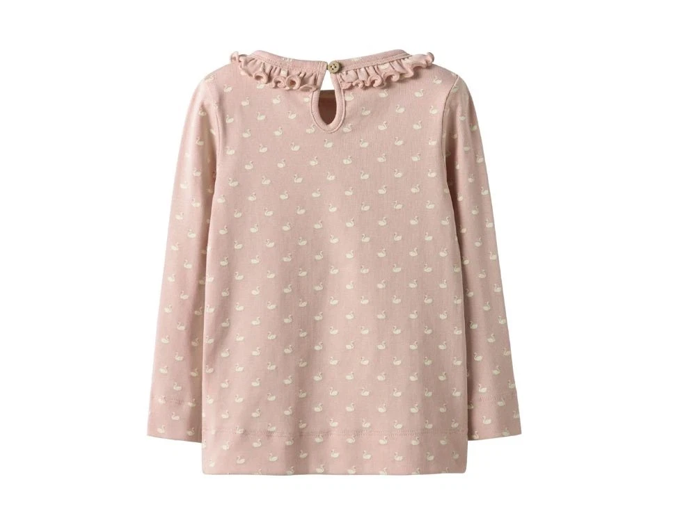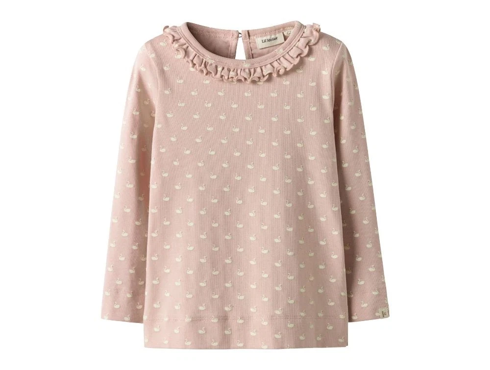 Langærmet top i lyserød fra Lil' Atelier med yndigt svaneprint over hele stoffet og en dekorativ flæsekrave ved halsen.