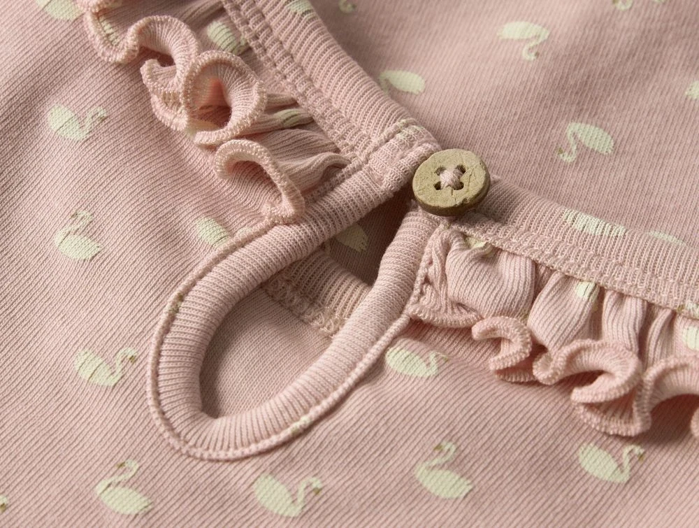 lil\' atelier langærmet top i lyserød med svaneprint og flæsekrave, set forfrabagside af lyserød lil\' atelier top med lange ærmer og svaneprintnærbillede af flæsedetalje og knaplukning i lyserød lil\' atelier top med svaner