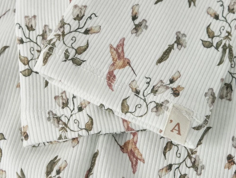 Leggings fra Lil\' Atelier i coconut milk med kolibriprint og elastik i taljenNærbillede af print og sømme på Lil\' Atelier leggings med kolibrier