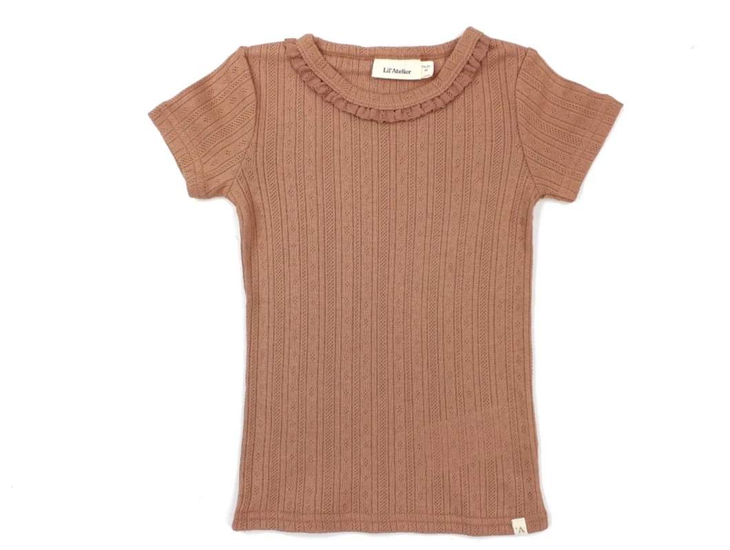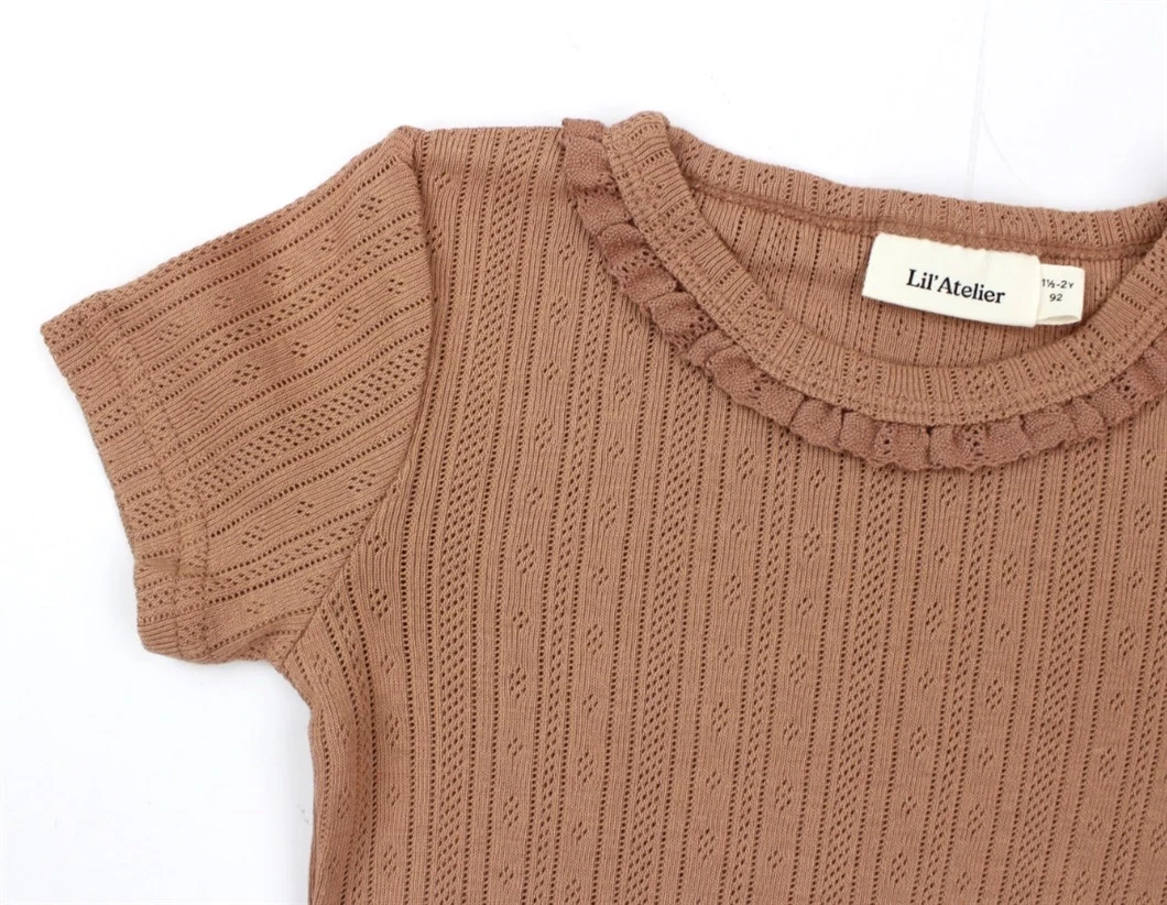Kortærmet top med hulmønster og lille blondeflæse i krave i farven mocha mousse fra Lil' Atelier.