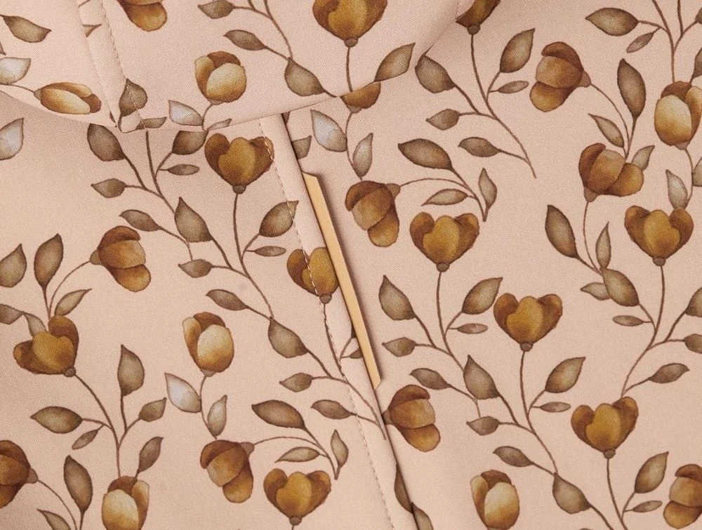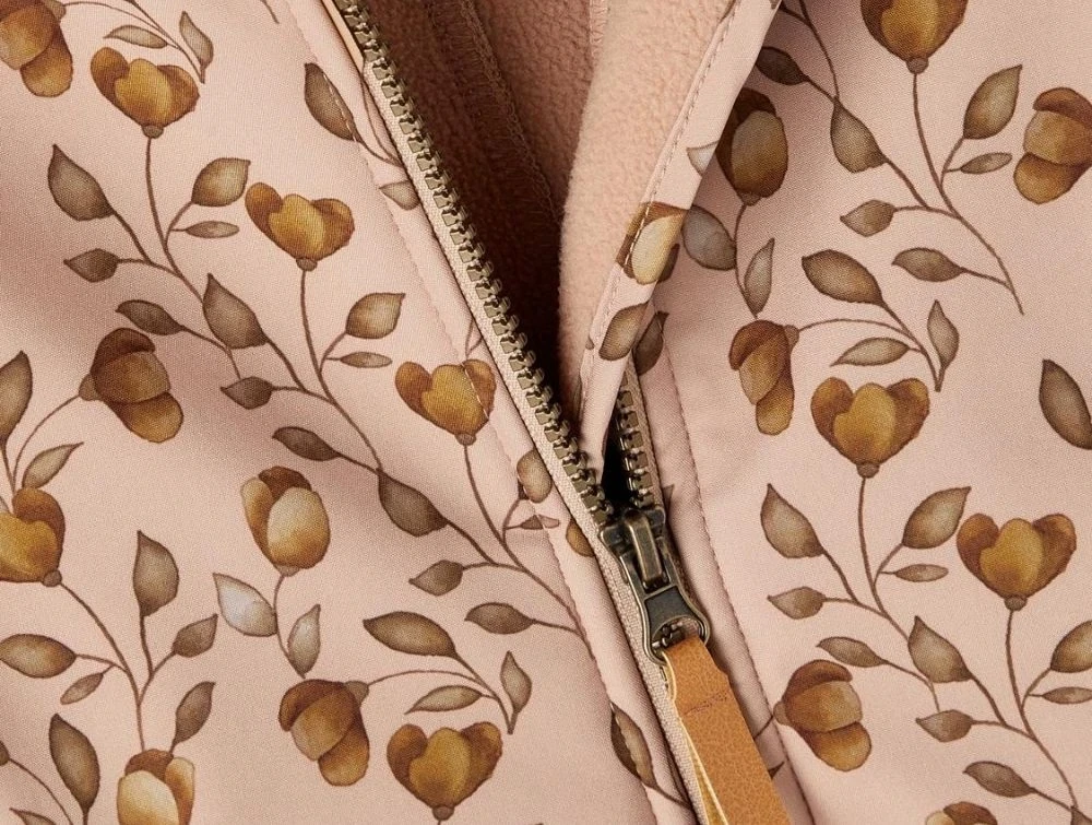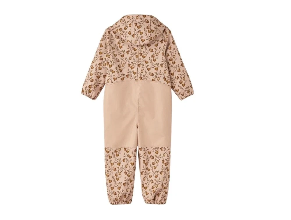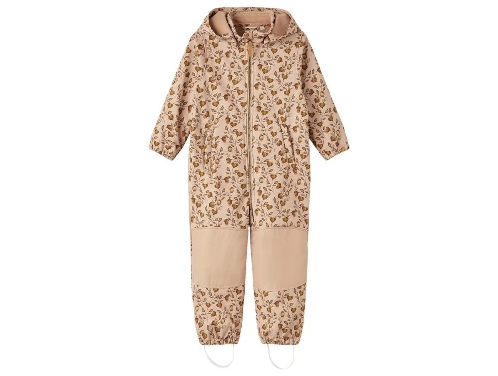 Lækker softshell heldragt i farven nougat med naturprint fra Lil' Atelier. Dragten har en aftagelige hætte med trykknapper og fleecefoer indvendigt.