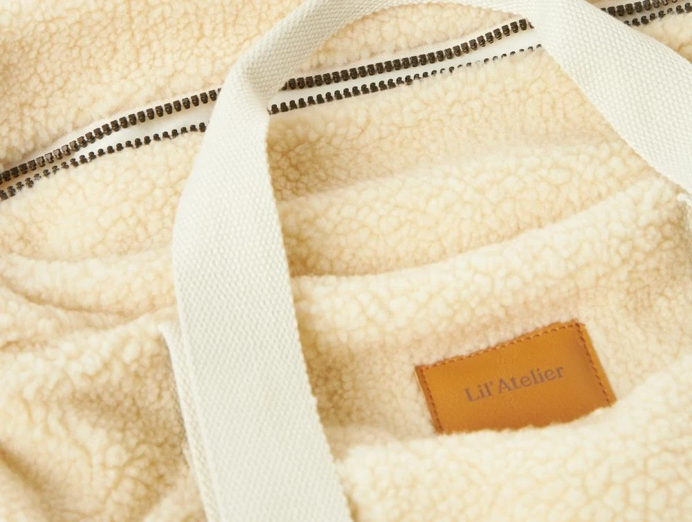 Praktisk og stilfuld råhvid pusletaske fra Lil' Atelier i blødt teddy-materiale med kraftige bomuldsstropper. Tasken er designet med funktionelle detaljer, der gør den ideel til hverdagsbrug med en baby.
