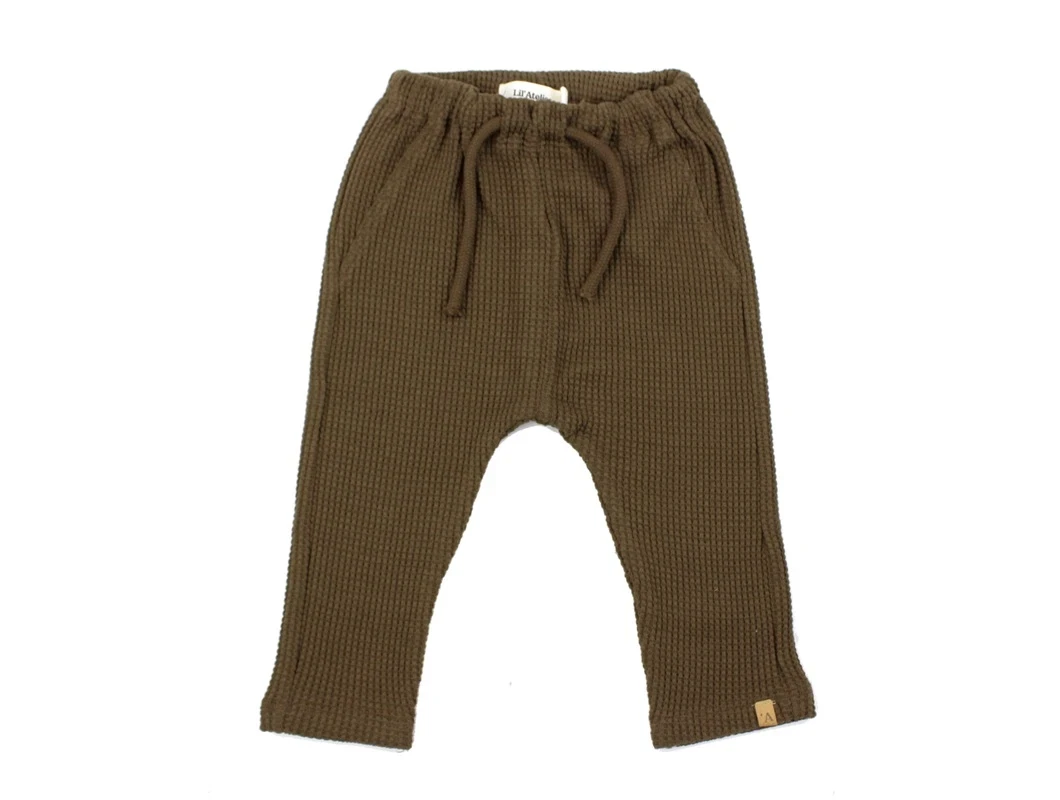 Skab det perfekte outfit til dit barn med et behageligt og trendy look. Disse bukser er i vaffelstrik, som er kendetegnet ved sin karakteristiske overflade med små rektangler, der skaber en sej tekstur. Bukserne er bløde og har en løs pasform, hvilket sikrer en behagelig følelse og fri bevægelighed.