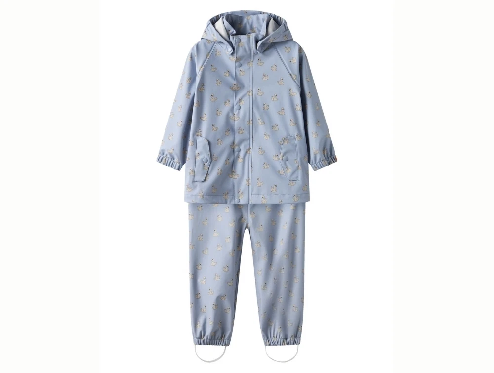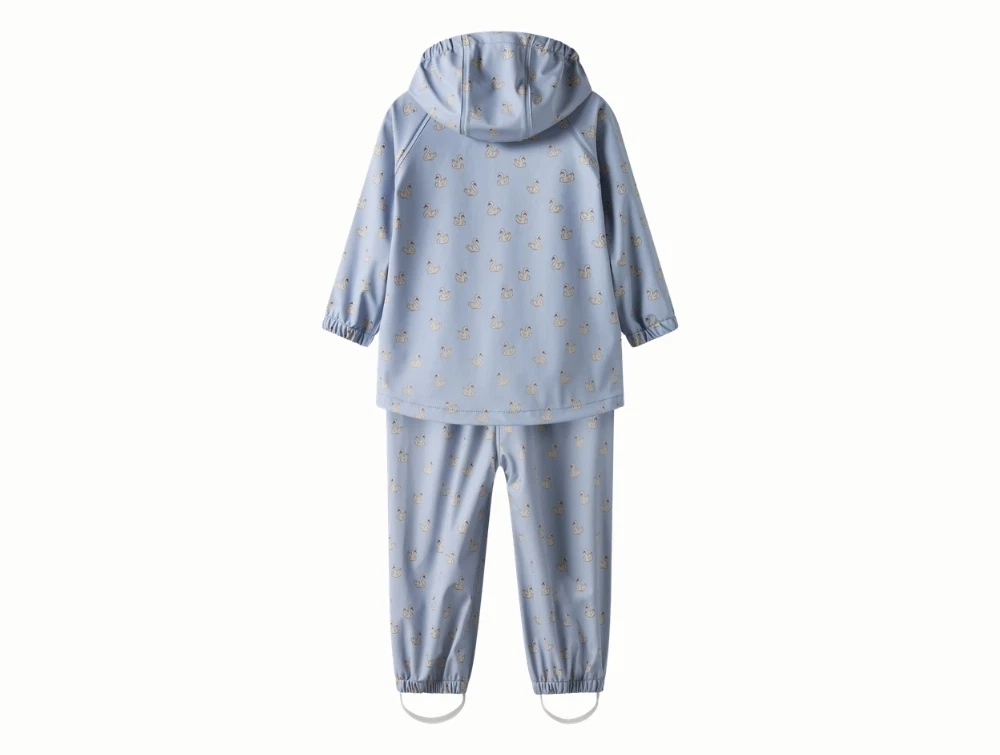 Regnsæt i blå nuance (zen blue) fra Lil' Atelier med fint svaneprint over hele sættet.