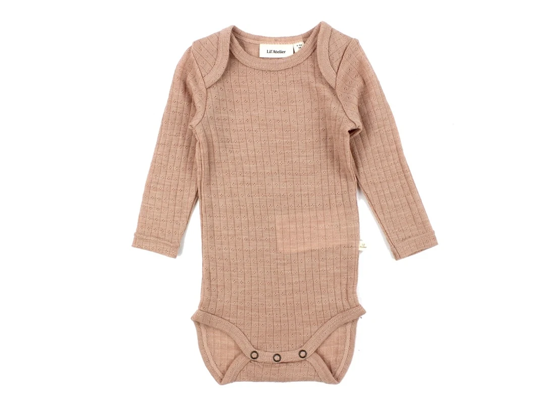 Uldbody med det fineste hulmønster i farven roebuck fra Lil' Atelier.