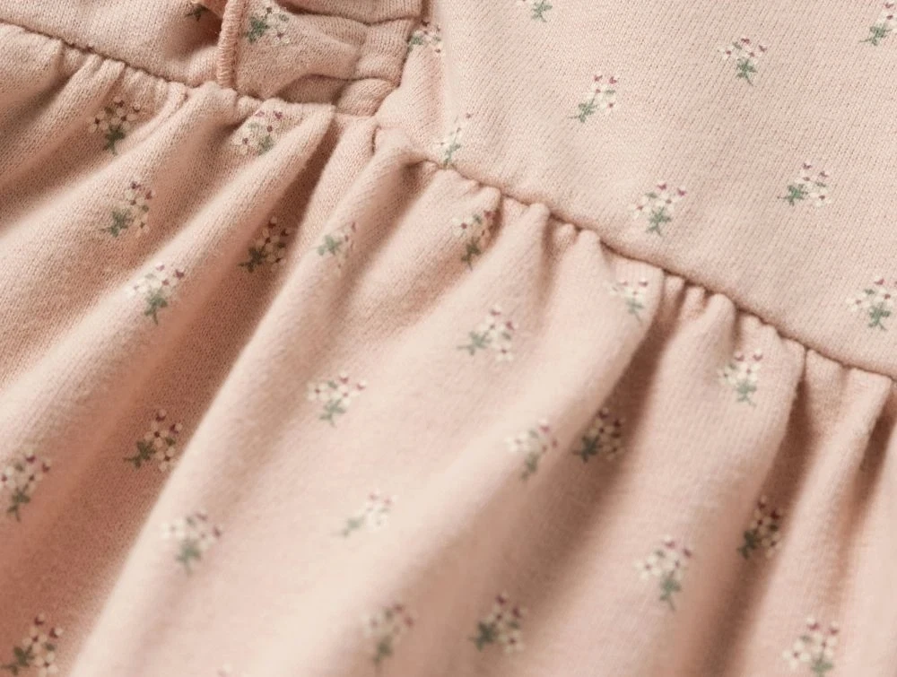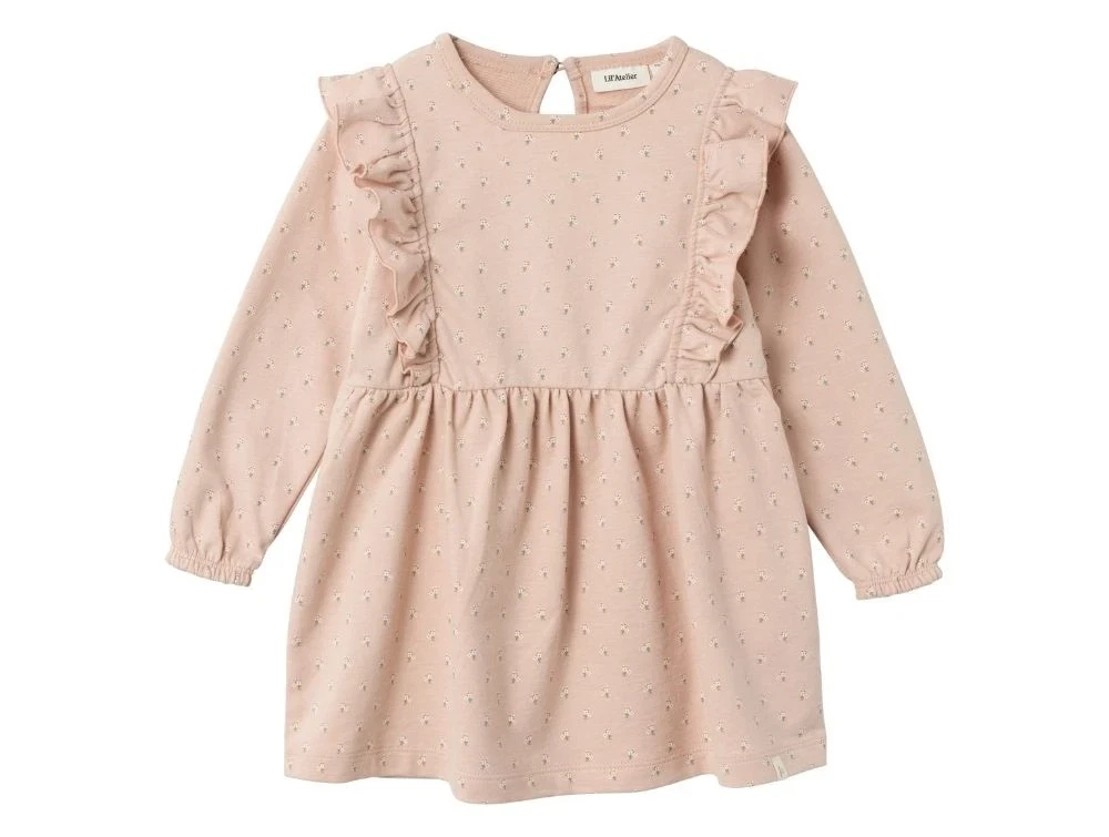 Sweatkjole i farven rose dust med det sødeste print af blomster og flæser fra Lil' Atelier.