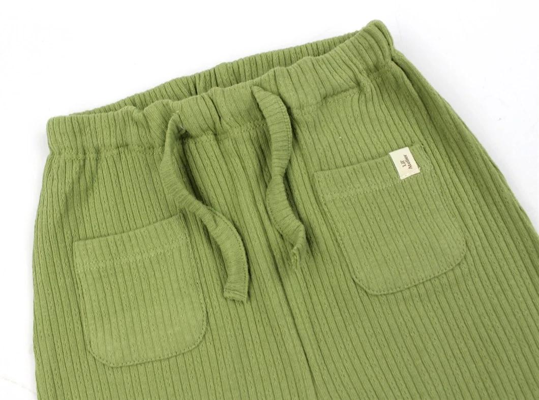 Løse bløde bukser i rib i farven sage med bølgekant i bukseben fra Lil' Atelier.
