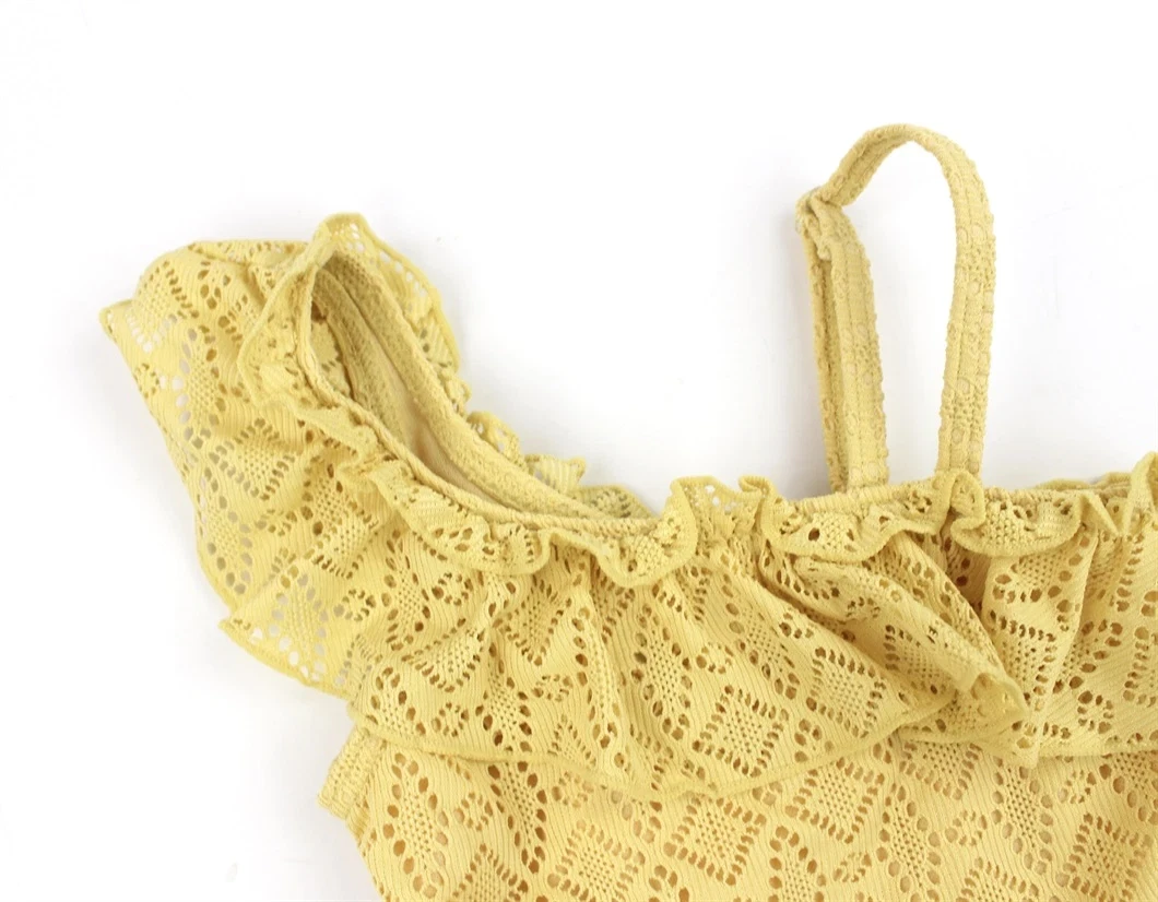 Badedragten har one-shoulder design og har blondeflæse-detalje. Den er fremstillet i en strækbar og hurtigtørrende kvalitet.