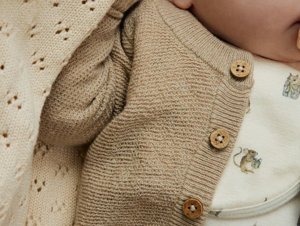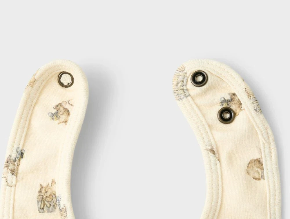 Smækken er lavet i blød, strækbar jerseykvalitet med trykknaplukning i nakken og afrundede kanter. Den kombinerer praktisk funktion med et nuttet design – perfekt til babyer, der savler eller spiser selv. Fremstillet i en blanding af økologisk bomuld og TENCEL™ lyocell.