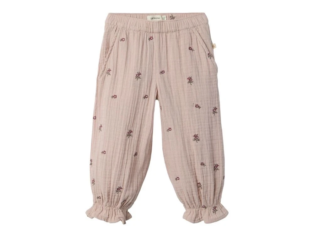 Bukser i farven shadow gray med blomsterbroderi fra Lil' Atelier. Der er justerbar elastik i linningen og to lommer. Produceret i 100% økologisk bomuld.