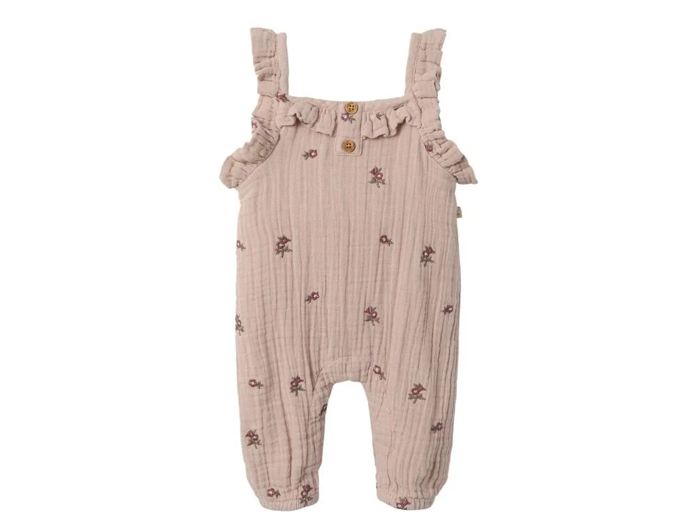 Overalls i farven shadow gray med blomsterbroderi fra Lil' Atelier. Der er trykknapper ved bukseben. Produceret i 100% økologisk bomuld.