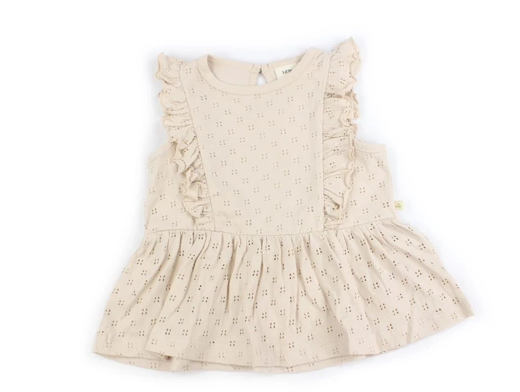 Top med hulmønster og flæser i farven shell fra Lil' Atelier.