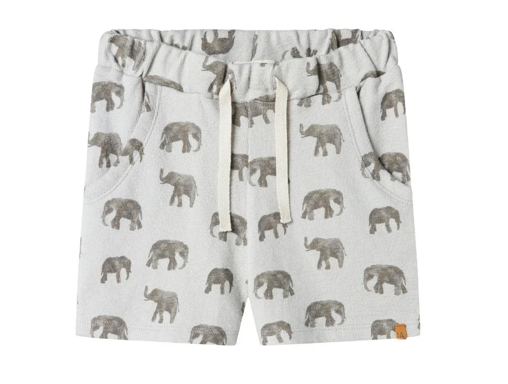 Shorts i lys blå fra Lil' Atelier med allover-print af grå elefanter og løs pasform med rynkeeffekt i taljen.