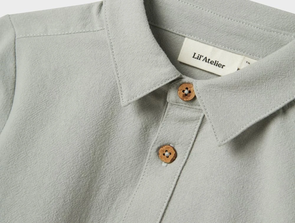 Skjorte fra Lil\' Atelier i mirage gray med træknapperDetalje af krave og knapper på Lil\' Atelier skjorte i mirage gray