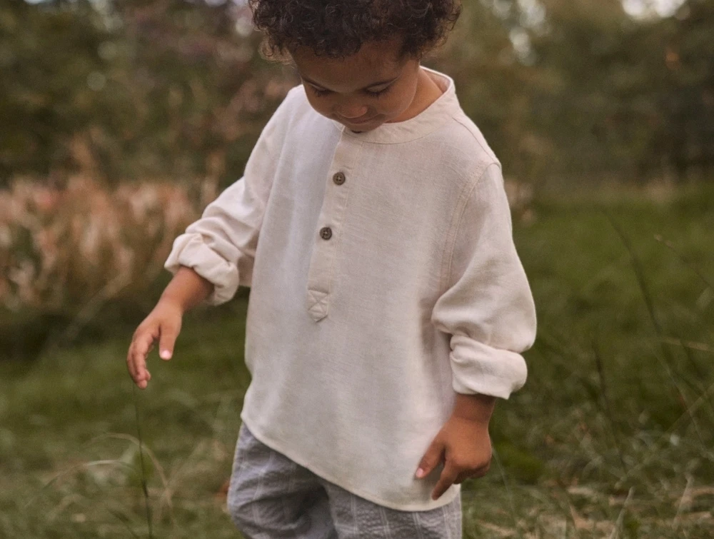 Den enkle kinakrave og den løstsiddende pasform giver et afslappet udtryk, mens knaplukningen foran gør skjorten nem at tage af og på. De lange ærmer afsluttes med manchetter for en pæn finish.