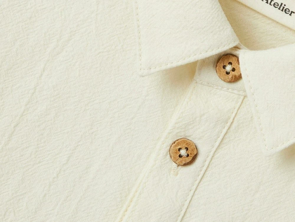 Skjorte fra Lil\' Atelier i turtledove med træknapperDetalje af krave og knapper på Lil\' Atelier skjorte i turtledove