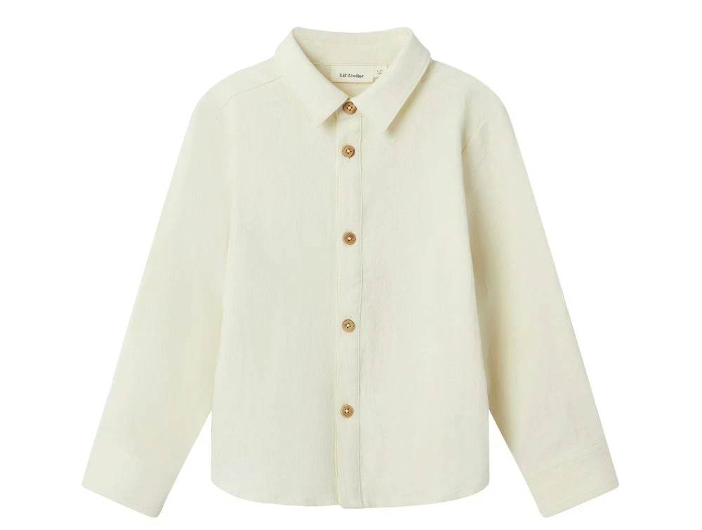 Langærmet skjorte i lys cremefarvet nuance fra Lil' Atelier med klassisk krave og dekorative træknapper.