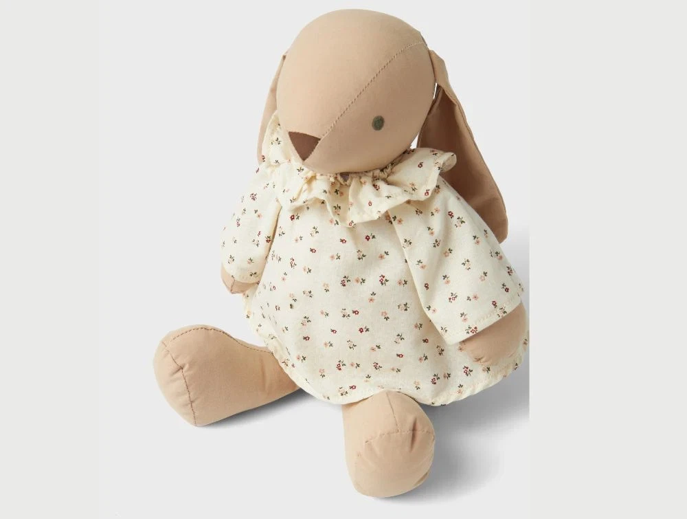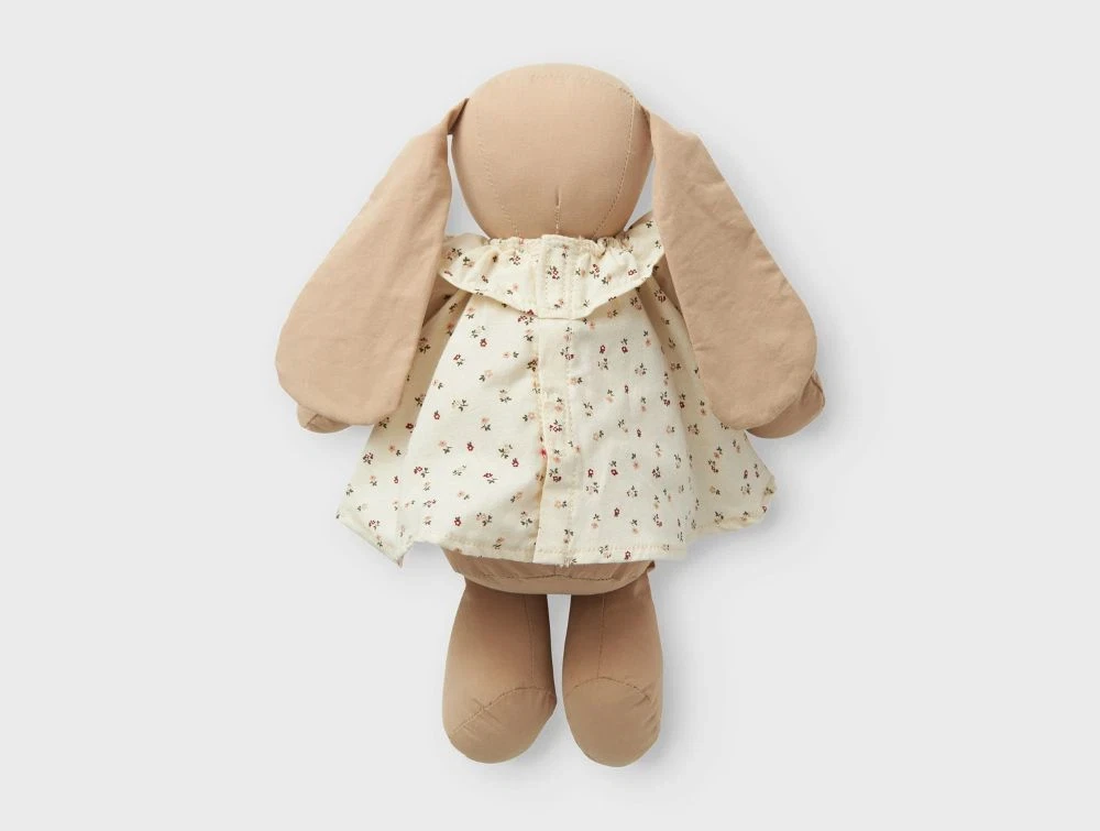Bamsen har et enkelt og blødt udtryk med ensfarvet lysebrun krop og lange, bløde ører. Den er iført en cremefarvet kjole med fine, små blomster i dæmpede røde og grønne nuancer samt flæsekrave. Lukningen bagpå er med velcro, og den er nem for små hænder at tage af og på. Et dekorativt og kærligt element på børneværelset – og en blød legekammerat til de mindste.