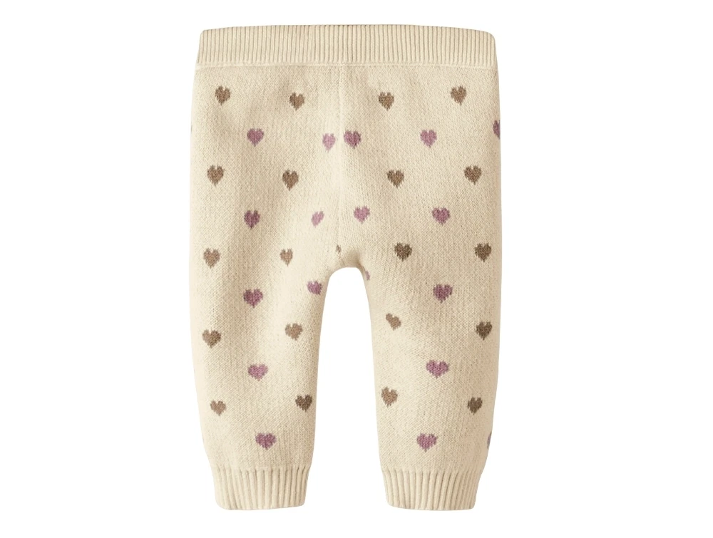 Strikbukser i råhvid nuance (turtledove) fra Lil' Atelier med små hjerter i brune og lilla toner.